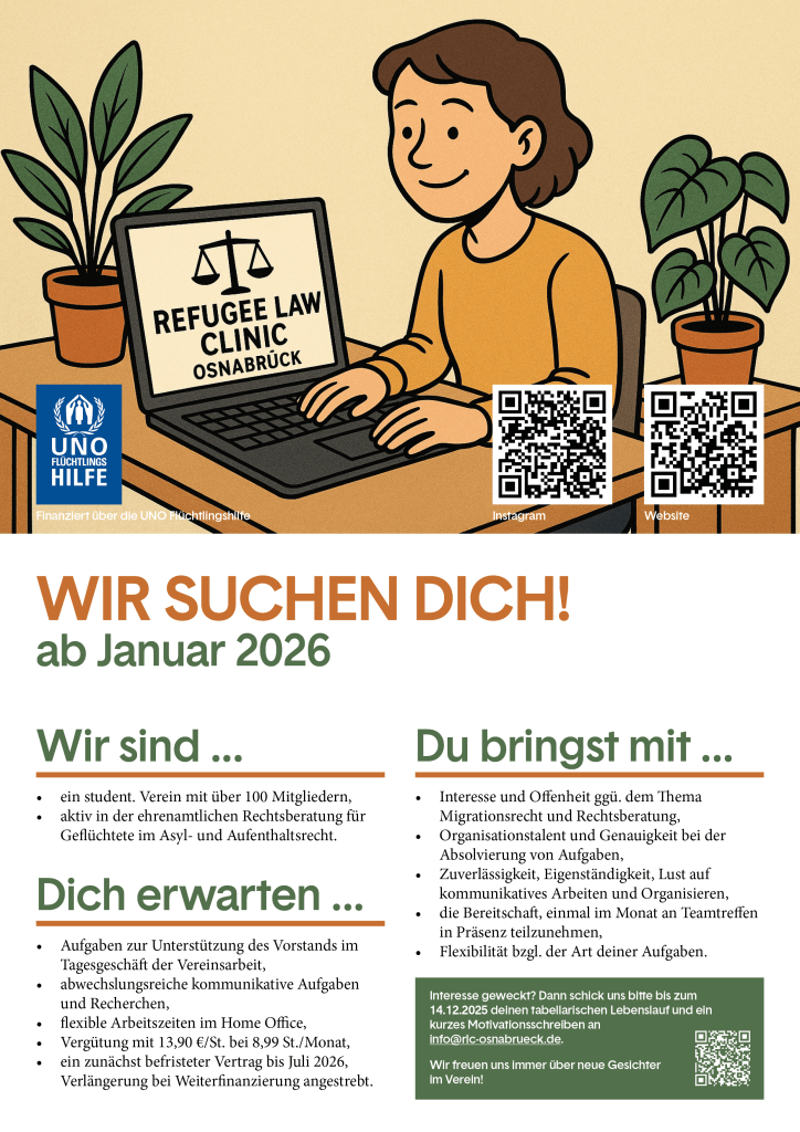 Es können sich alle Menschen auf diese Stelle bewerben, egal ob Ihr schon in der RLC tätig seid/ward oder nicht, d.h. diese Ausschreibung ist an alle gerichtet, die Interesse an der RLC-/Vereinsarbeit haben und sich für die Rechte von Schutzsuchenden einsetzen möchten. Wir werden Euch gut einarbeiten, sodass keine Vorkenntnisse oder eine Ausbildung in der studentischen Rechtsberatung nötig sind.