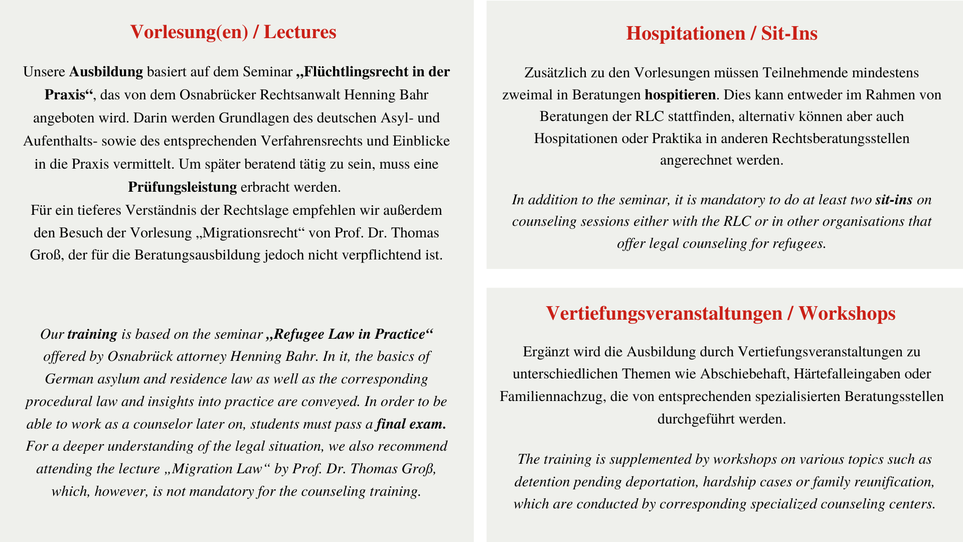 Wir freuen uns immer über Unterstützung – sei es im Orga-Team, als Dolmetscher:in oder in der Rechtsberatung. In unserem Orga-Team oder als Dolmetscher:innen seid ihr jederzeit herzlich eingeladen, euch einzubringen, auch ohne Vorkenntnisse im Migrationsrecht. Kontaktiert uns dazu gerne einfach unter info@rlc-osnabrueck.de. Als Grundlage der Beratungstätigkeit haben wir eine Ausbildung konzipiert, die aus mehreren Teilen besteht und die Teilnehmer:innen sowohl in ihren inhaltlichen Kompetenzen als auch hinsichtlich ihrer praktischen Erfahrung stärken soll.